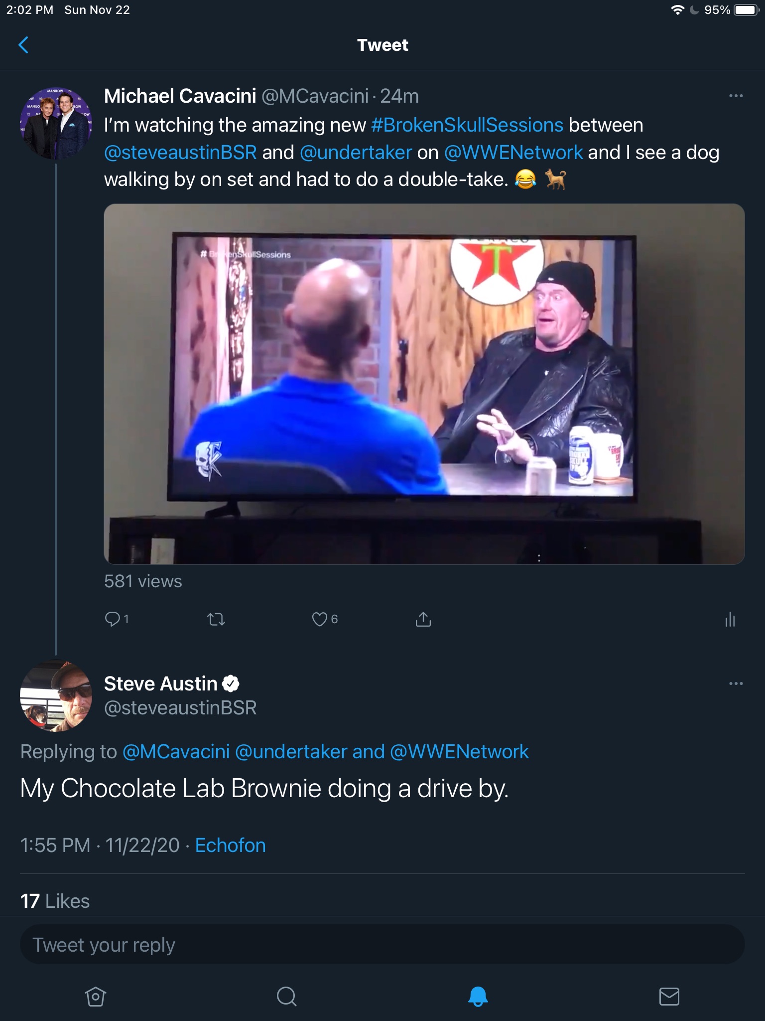 Earlier today, I watched the new Broken Skull Sessions featuring a new interview between Stone Cold Steve Austin and The Undertaker. While watching the show, I noticed a dog walk by on screen, so I recorded this part with my phone and tweeted about it. To my suprise, Stone Cold himself replied to my tweet saying the following: “My Chocolate Lab Brownie doing a drive by.” This made my day and was a great way to set the tone for what promises to be a memorable Survivor Series.