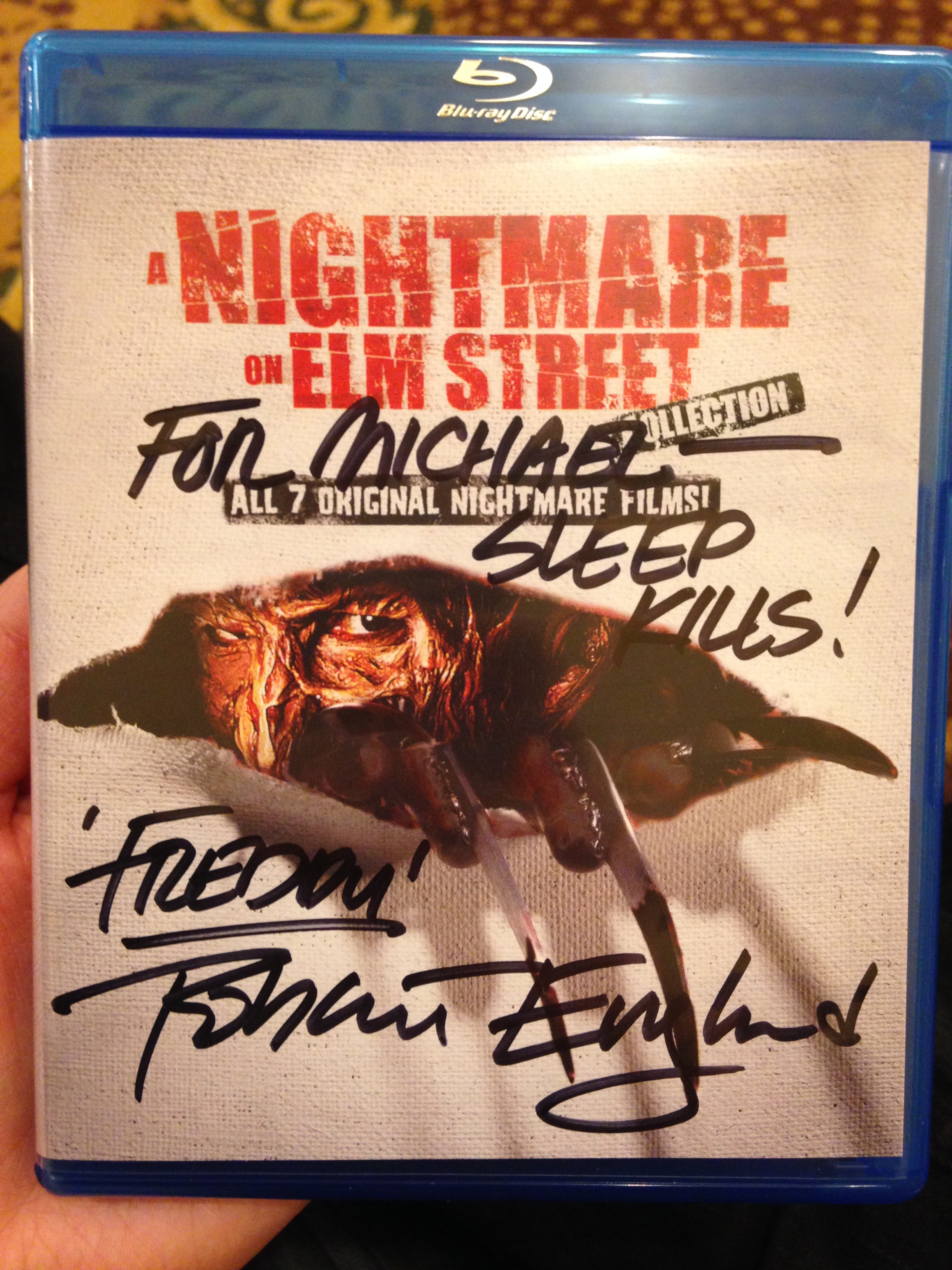 Despite being told I couldn’t get a photo with Robert, I had the girl in front of me take of photo of him and I with my phone. I couldn’t go around the table for the photo because a bodyguard was there, but I made the most of it and I think the photo turned out quite nice. When we were posing for the photo, Robert said, “Tell me when to look up” as he was autographing my item. The girl taking the photo said, “Look up” and Robert jokingly said in his Freddy Krueger voice, “Take the picture, biotch!” When we left she was on cloud nine that he spoke to her in his Freddy voice and we both laughed hysterically about what a cool moment it was.